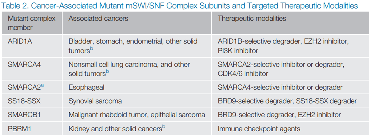 SWI/SNF復(fù)合物的催化亞基和核心亞基在體細(xì)胞或胚系背景中發(fā)生缺失或突變可造成編碼蛋白失活和復(fù)合物整體功能異常,導(dǎo)致腫瘤發(fā)生。核心亞基SMARCB1(INI1)突變已被熟悉,但催化亞基SMARCA4突變相對(duì)較為少見(jiàn),除傳統(tǒng)卵巢高鈣血癥小細(xì)胞癌(SCCOHT)外。