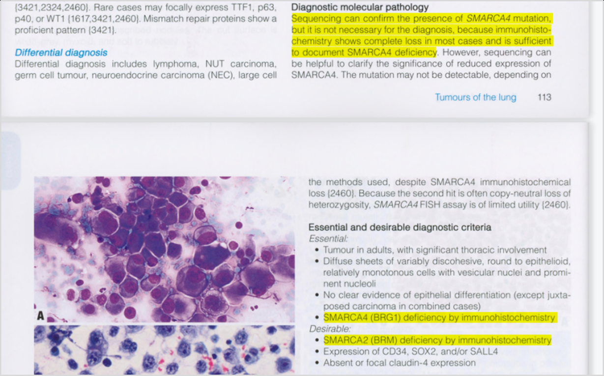 關(guān)于SMARCA4(BRG1)基因突變和蛋白表達(dá),在WHO胸部腫瘤分類(lèi)指南中在該癌種的診斷分子病理部分這樣提及:基因測(cè)序可以證實(shí)SMARCA4突變的存在,但由于免疫組化檢測(cè)在大多數(shù)情況下能夠顯示SMARCA4蛋白全部缺失,進(jìn)而能夠確診SMARCA4缺陷型腫瘤,基因測(cè)序在診斷上并非必須的。