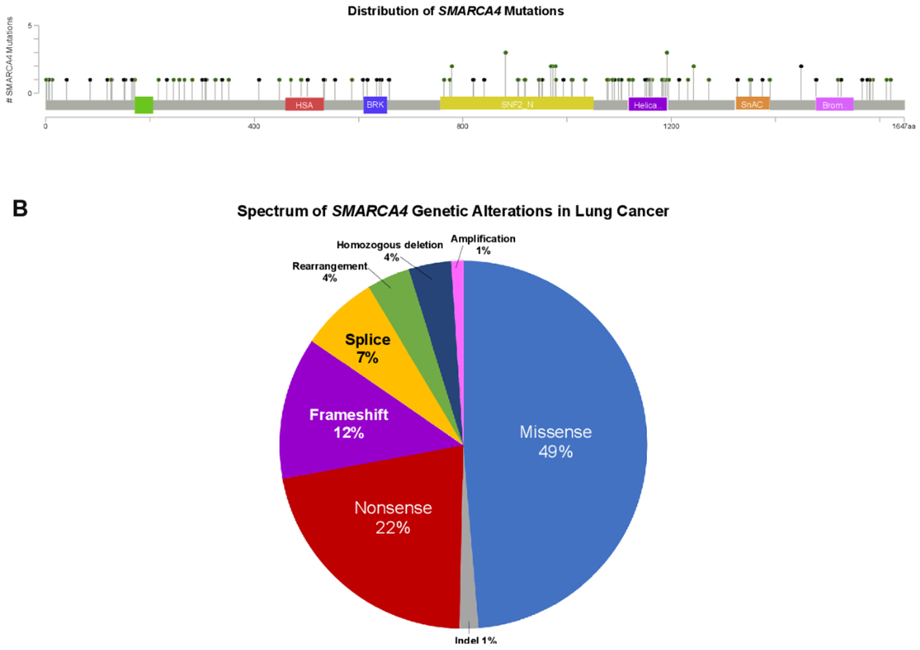 截?cái)嗤蛔?即移碼或無(wú)義突變)占42%的SMARCA4突變。8個(gè)樣本攜帶兩個(gè)或更多的SMARCA4突變。SMARCA4突變分布在整個(gè)基因中,涉及大多數(shù)結(jié)構(gòu)域。