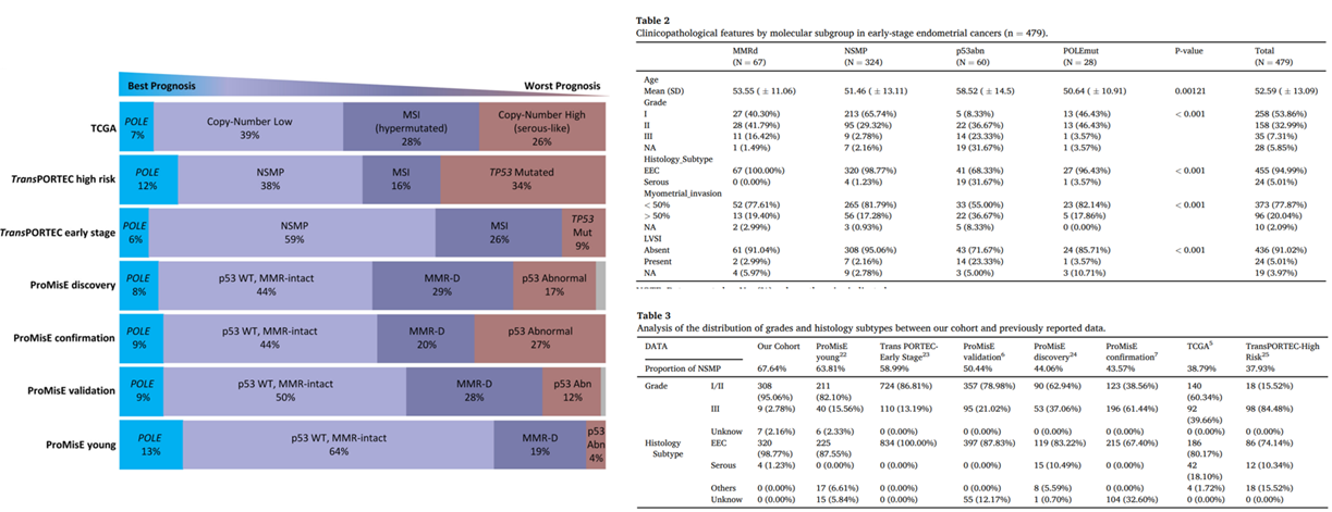 也有聯(lián)合雌激素受體(ER)狀態(tài)進(jìn)一步細(xì)分,如ESGO–ESTRO–ESP子宮內(nèi)膜癌指南將NSMP型根據(jù)分級(jí)(grade)和雌激素受體(ER)狀態(tài)進(jìn)一步細(xì)分:G1–2且ER陽性歸為較低風(fēng)險(xiǎn)因素;G3和/或ER陰性歸為高風(fēng)險(xiǎn)因素[4]。