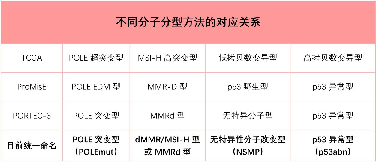 TCGA子宮內(nèi)膜癌分子分型整合了基因組學(xué)、轉(zhuǎn)錄組學(xué)、蛋白組學(xué)、基因拷貝數(shù)和甲基化數(shù)據(jù),將EC分為POLE超突變型(POLE ultramutated,POLEmut)、微衛(wèi)星高度不穩(wěn)定型(microsatellite instability-high,MSI-H)、低拷貝數(shù)型(copy number low,CNL)、高拷貝數(shù)型(copy number high,CNH)4種亞型。此后很多學(xué)者對(duì)EC分子分型進(jìn)行了方法學(xué)簡化及流程優(yōu)化,提出了TransPORTEC和ProMisE分子分型策略,分子分型也逐步占據(jù)越來越重要的地位。現(xiàn)如今分子分型已被國內(nèi)外指南共識(shí)所推薦,F(xiàn)IGO 2023新版分期也納入了分子特征[1]。