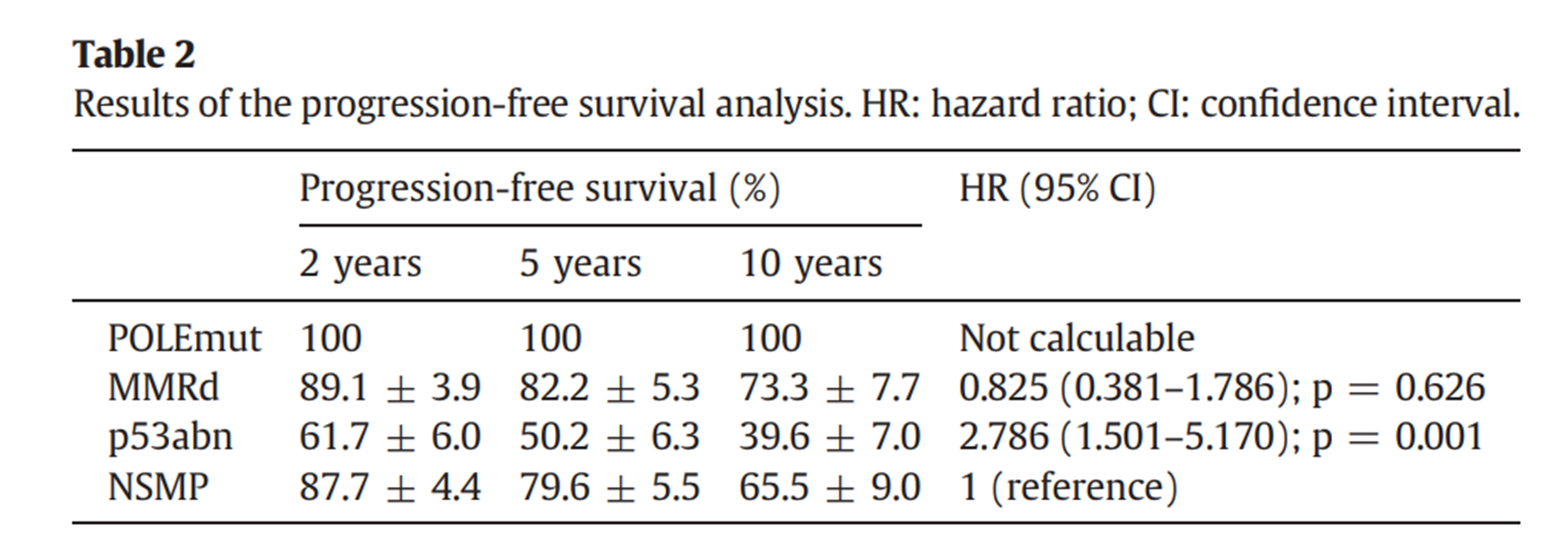 由于卵巢子宮內(nèi)膜樣癌與子宮內(nèi)膜樣子宮內(nèi)膜癌在組織病理學(xué)和分子特征上具有相似性,因此可將EC分型擴展應(yīng)用于上,一項研究顯示,卵巢子宮內(nèi)膜樣癌與子宮內(nèi)膜子宮內(nèi)膜樣癌中各TCGA分子亞型的占比對比情況如下:POLE突變型占比分別為5%和7.6%(P=0.594);錯配修復(fù)缺陷型占比分別為14.6%和29.2%(P<0.001);p53異常型占比分別為14%和7.8%(P=0.097);無特殊分子譜型占比分別為66.4%和55.4%(P=0.002)。無進(jìn)展生存期分析在下表中顯示。