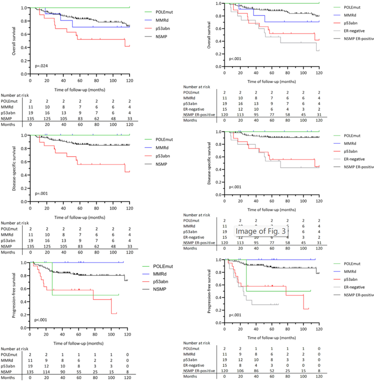 另一項多中心回顧性隊列研究,來自多家醫(yī)院的相對較大隊列規(guī)模以及較長的隨訪時間。此外,婦科病理學(xué)家對組織學(xué)和免疫組化染色結(jié)果進(jìn)行了獨立審查,并對存在分歧的病例進(jìn)行了共同審核。最終結(jié)果為,在167例納入的患者中,1.2%的患者腫瘤為POLEmut型,6.6%為MMRd型,11.4%為p53abn型,80.8%為NSMP型。在POLEmut和MMRd亞型中未發(fā)現(xiàn)ER陰性腫瘤,且在p53abn亞型中,ER狀態(tài)無預(yù)后價值。在NSMP亞型中,11.1%的腫瘤為ER陰性,其10年總生存率更低(HR=3.92,95% CI=1.67-9.21,p=0.002)[6]。